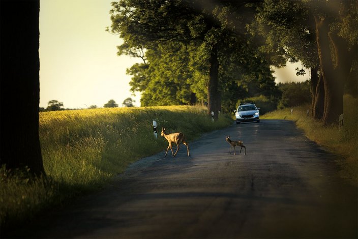 Autofahrer und Motorradfahrer sollten insbesondere an den Wald-Feld-Kanten ihre Geschwindigkeit reduzieren und sich auf plötzlich auftauchendes Rehwild einstellen. Meist sind Wildtiere nicht alleine unterwegs, es können also noch weitere Tiere folgen.