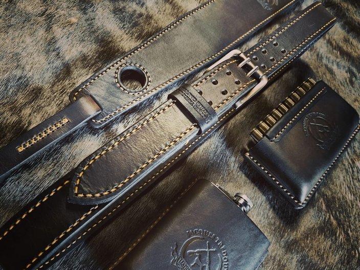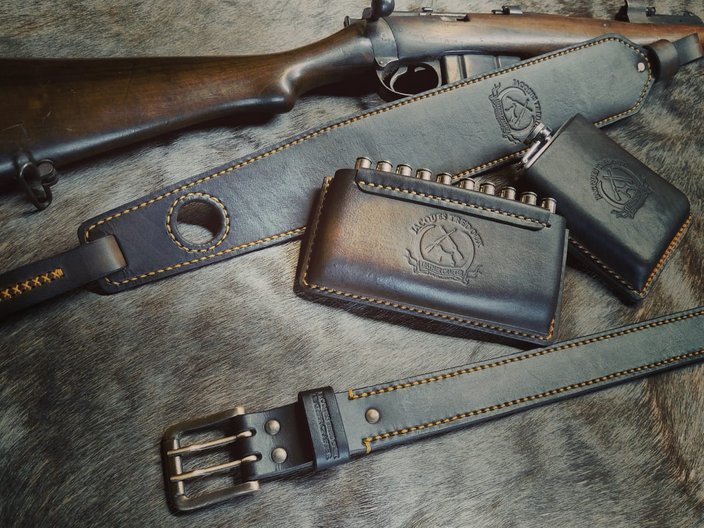 Vier-in-einem-Set handgefertigter Lederaccessoires für den anspruchsvollen Jäger, bestehend aus einem Gewehrgürtel, einer Flachmannflasche (leider ohne Inhalt), einer Munitionstasche für 10 Patronen des Kalibers .30 oder ähnlichem und einem Gürtel in der gewünschten Länge.